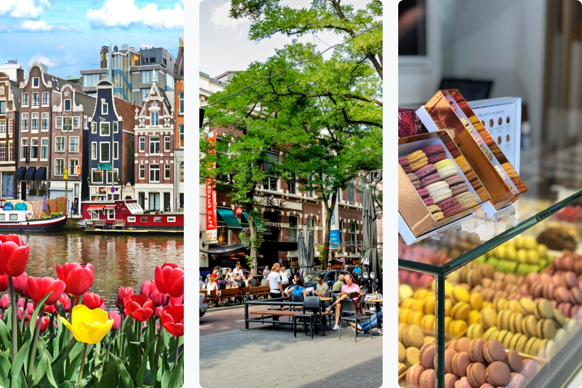 Tulpaner i färgglada sjok, knoppar som slår ut och vårsol på charmiga torg! Amsterdam är en promenadvänlig och charmig stad.