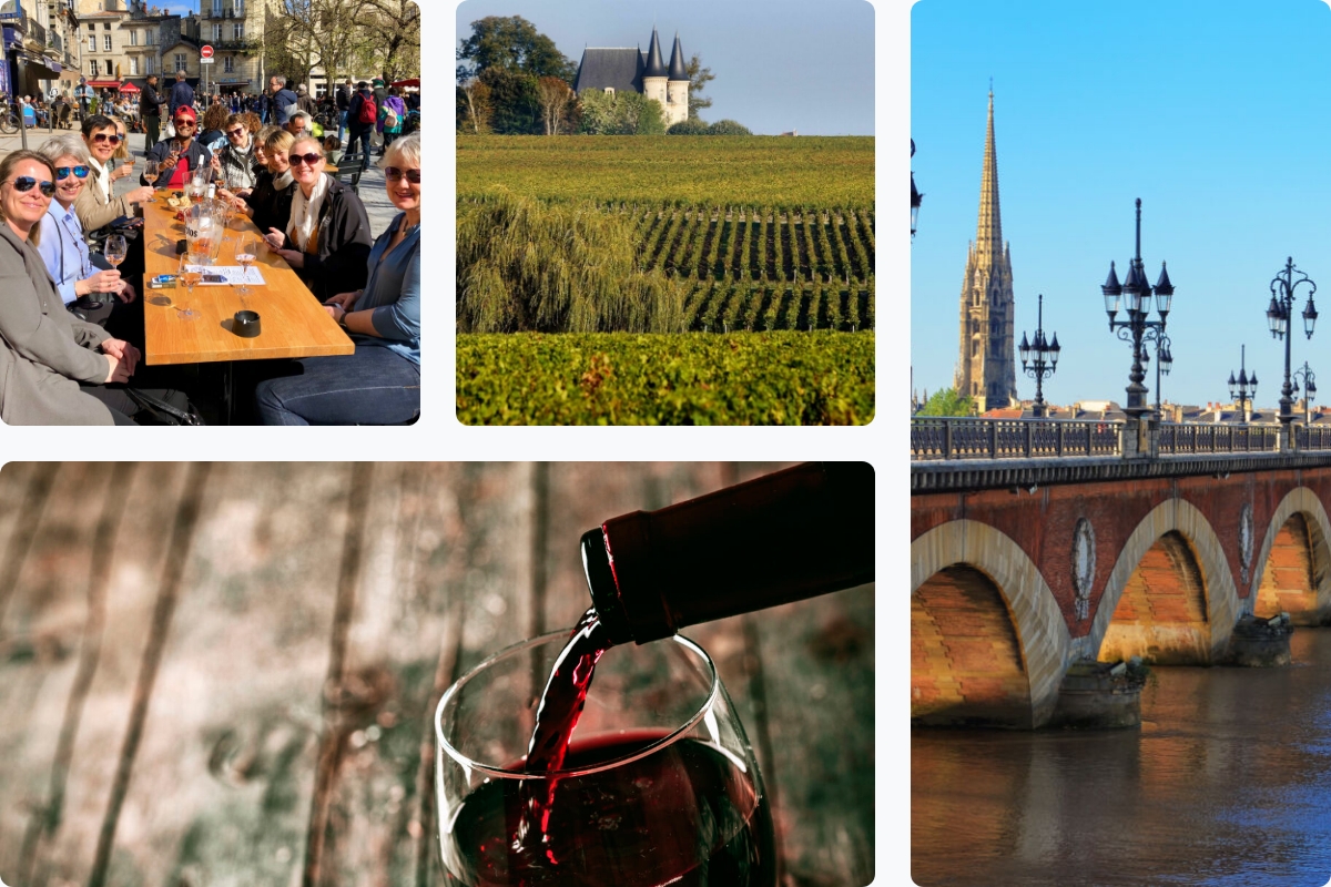 Vi ser vingårdar, vinslott och gröna landskap med vinorterna kring Médoc, Pauillac, Cadillac och kullerstensbyn Saint-Émilion.